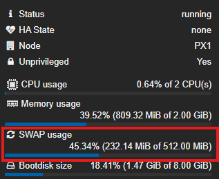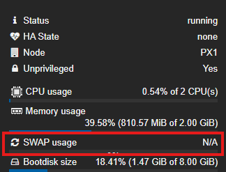 Posicionándonos en el contendor lxc, si vamos al apartado «Summary» veremos desde «SWAP usage» está utilizando en este caso 45% del swap asignado.