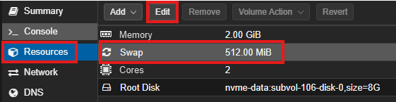 Tan sencillo como irnos a «Resources», seleccionar «Swap» y darle al botón editar para modificar el parámetro de swap.