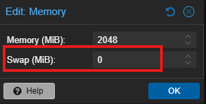 Dentro del editor de «Memory», pondremos «Swap (MiB)» de 512 a 0. Daremos a OK