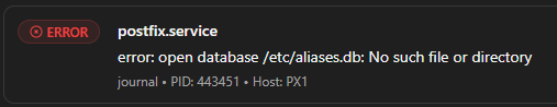 El error en los logs de Proxmox VE 9.1 indica que Postfix no puede abrir la base de datos de alias de correo /etc/aliases.db, que falta o está corrupta. Este problema surge cuando servicios como SMART o backups intentan enviar alertas por email a «root» pero Postfix no resuelve los alias correctamente.